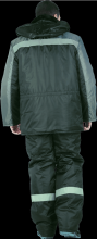 Костюм состоит из куртки и брюк. Куртка с потайной застежкой на пуговицы, СОП 5 см по линии кокетки. Воротник втачной из искусственного меха. Съемный капюшон, без утеплителя. На куртке два вместительных нижних накладных кармана с клапанами. Объем талии куртки регулируется кулисой. Брюки с широким поясом и двумя накладными карманами, СОП 5 см по низу брюк.