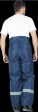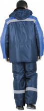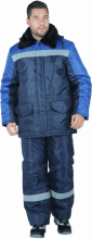Костюм состоит из куртки и брюк. Куртка с потайной застежкой на пуговицы, СОП 5 см по линии кокетки. Воротник втачной из искусственного меха. Съемный капюшон, без утеплителя. На куртке два вместительных нижних накладных кармана с клапанами. Объем талии куртки регулируется кулисой. Брюки с широким поясом и двумя накладными карманами, СОП 5 см по низу брюк.