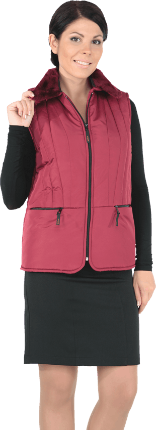 Женская модель утепленного жилета с центральной застёжкой на молнию и вертикальной стёжкой. Съёмный воротник из искусственного меха. Удобные карманы на молнии. Рекомендуется для работы и повседневной носки.