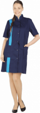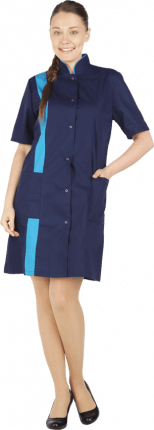 Халат полуприлегающего силуэта с центральной застёжкой на кнопки, с рельефами от плечевых швов, накладными карманами, воротником-стойкой, втачными рукавами, хлястиком. Декоративная вставка на полочке и нижний воротник из отделочной ткани по всей длине рельефа.