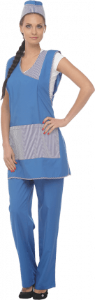 Состоит из брюк, фартука, пилотки. Фартук со вставкой по линии горловины. Брюки с поясом на эластичной ленте. Для отделки используется ткань–«компаньон» или контрастная ткань.