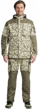 В области колен расположены усиленные накладки с карманами для съемных вкладышей. Накладки на плечах, задних половинках брюк, нижняя часть брюк, наколенники, налокотники выполнены из непромокаемой ткани