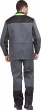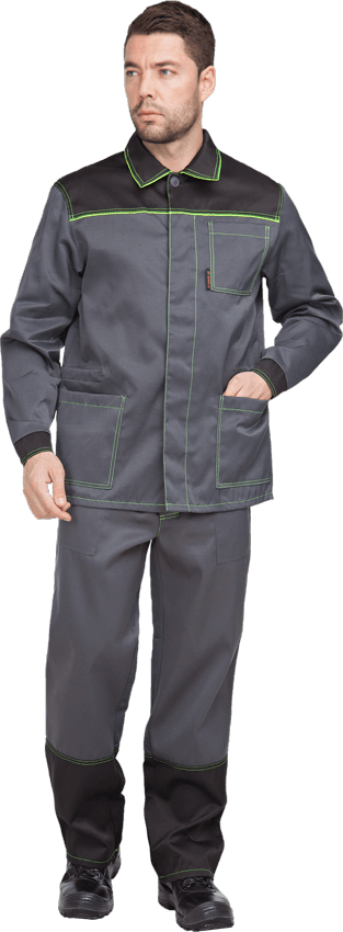 Костюм состоит из куртки и брюк. Костюм отстрочен нитью контрастного цвета.
