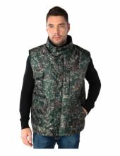 Жилет утепленный с подкладом из флиса. Центральная застежка на двухзамковой разъемной молнии, закрытой ветрозащитным клапаном. Полочки и спинка с кокетками. На правой полочке объемный карман с клапаном на текстильной застежке. Два боковых объемных накладных кармана с клапанами на текстильной застежке с двумя входами: наклонным на молнии и верхним под клапаном. На левой полочке вертикальный прорезной карман на молнии.