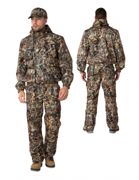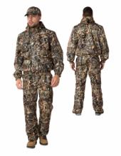 Костюм мужской, состоит из куртки и брюк. Подкладка - трикотажная сетка. На куртке - объемные накладные карманы под патроны, телефон, рацию.