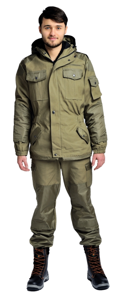 Костюм состоит из куртки и брюк. Куртка с центральной застежкой на молнию, капюшон со съемной противомоскитной сеткой, накладные карманы с клапанами на кнопках. Объем талии куртки регулируется кулисой. Рукава на манжете.