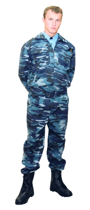 Костюм мужской, состоит из куртки и брюк. Куртка прямого силуэта с центральной застёжкой на молнию, верхними накладными карманами с клапанами на кнопках и нижними карманами с «листочкой» на молнии, отложным воротником. Пояс куртки стянут эластичной тесьмой. На плечевых швах погоны на кнопке. Брюки с прорезными боковыми карманами. На передних половинках брюк застрочены стрелки.