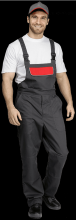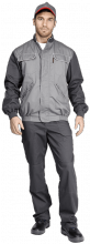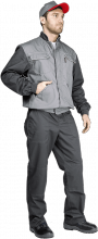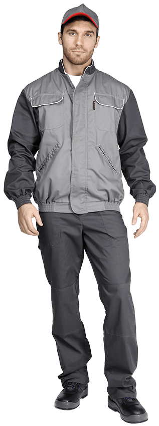 Костюм мужской состоит из куртки и полукомбинезона. Куртка прямого силуэта с центральной бортовой застежкой на молнии, закрытой планкой. На полочках -накладные нагрудные карманы с клапаном. Рукав на манжете на эластичной тесьме со вставкой. Полукомбинезон с застежкой на молнию. Бретели со вставками на эластичной резиновой тесьме застежкой фастексы. На груди накладной карман с клапаном. В клапан вставлен кант. На передних половинках брюк боковые косые карманы со светоотражающим кантом. На уровне колен расположены наколенники.