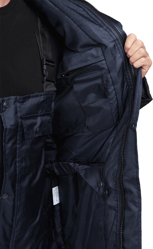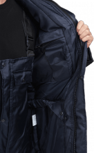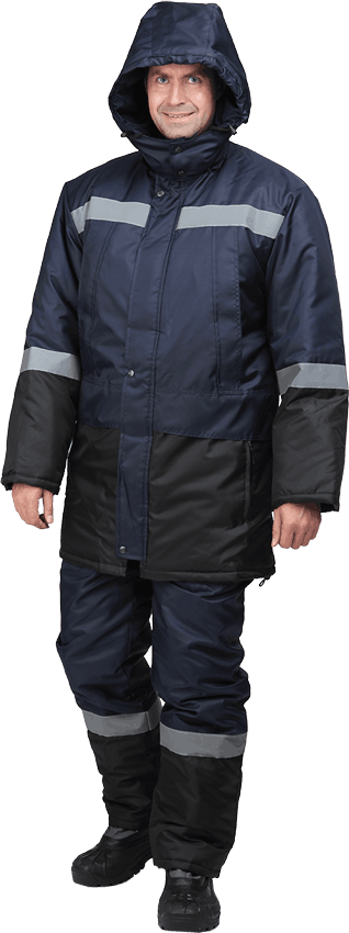 Костюм рекомендуется для работ в условиях пониженных температур. Состоит из куртки и полукомбинезона. Удлинённая куртка с центральной застежкой на молнию и ветрозащитным клапаном, съёмным капюшоном. В костюме используются разнообразные функциональные карманы. Детали куртки комбинируются из ткани двух цветов. Полукомбинезон с ветрозащитной планкой на кнопках, с карманами. На куртке и полукомбинезоне используются световозвращающие полосы.
