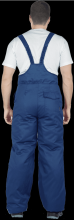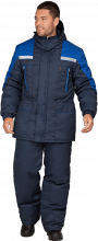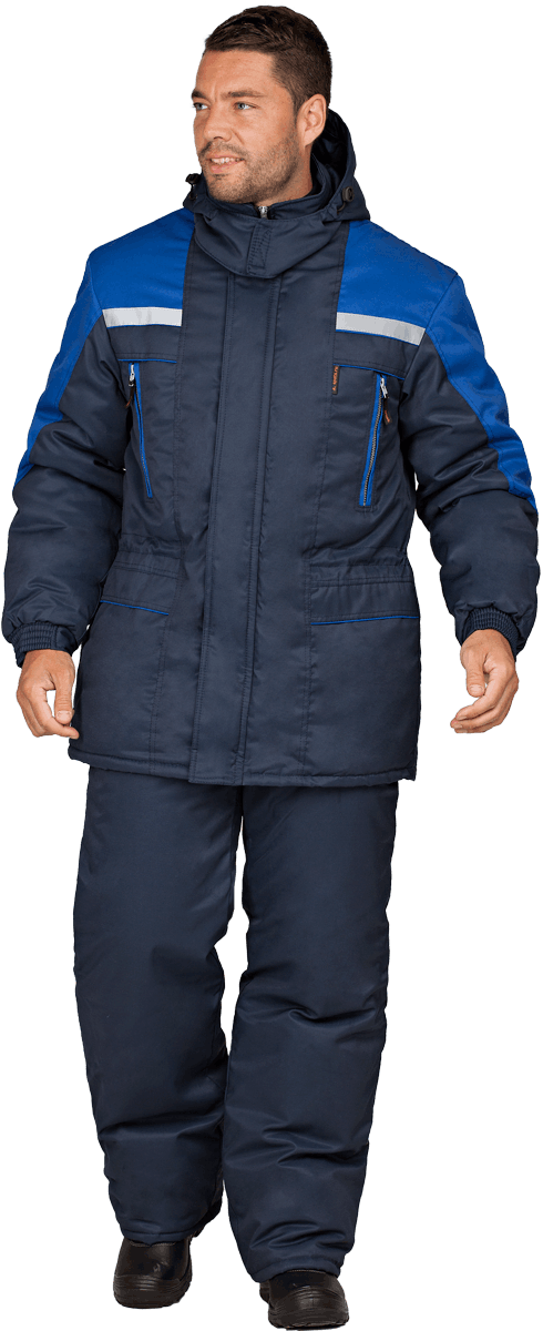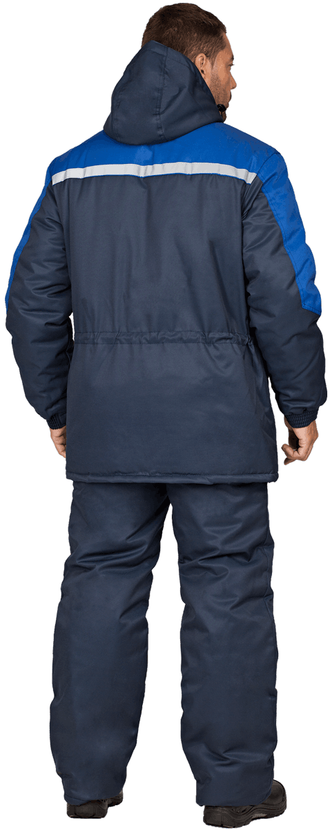 Удлинённая куртка с центральной застежкой на «молнию», ветрозащитным клапаном и съёмным капюшоном. Прорезные карманы и карманы в шве отделаны контрастным кантом. Детали куртки комбинируются из ткани двух цветов, используются световозвращающие полосы. Брюки с завышенной талией на лямках.