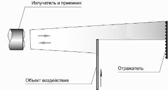 Оптический датчик типа R имеет размещенный в одном корпусе излучатель и приемник. Приемник принимает луч излучателя, отраженный от специального отражателя.