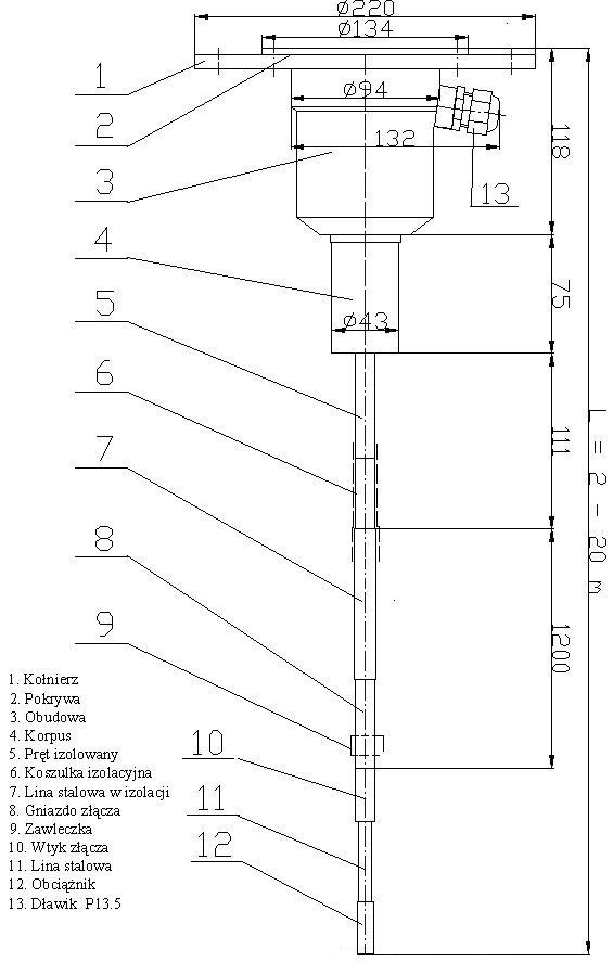 Омичные сигнализаторы уровня LSP-1 и 2 состоят из двух электродов и электронной схемы. Один электрод, соединённый с землёй, образует крепёжный воротник 1, корпус электронной схемы 3 и корпус 4 в сигнализаторе LSP-1, или корпус электроники 3 и корпус 4 в сигнализаторе LSP-2. Второй электрод состоит из несменяемой и сменной части. Несменяемая часть состоит из изолированного прута 5, соединённого постоянно со стальной лентой в изоляции 7, изоляционной рубашки 6, и гнезда 10, не изолированной стальной проволоки 11 и натяжителя 12. Электронная схема закреплена на вертикальной плите. На вертикальной плите находится щит с выключателями, включатель «тест», зелёный и красный диоды. Крышка снабжена смотровым окном, через которое можно наблюдать за работой сигнализатора.