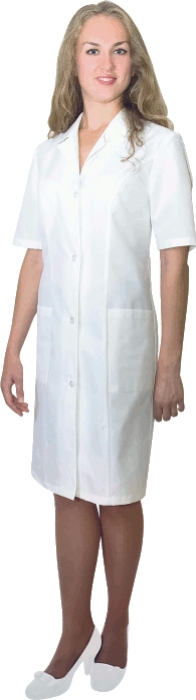 Укороченная модель с центральной застежкой на пуговицы, рельефами на полочке и спинке, отложным воротником. Втачной короткий рукав. На спинке хлястик. Халат применим как в медицине, так и в сфере обслуживания. ГОСТ 25294-2003.