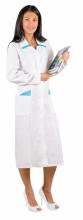 Халат полуприлегающего силуэта на пуговицах. Изюминка модели в конструктивном решении горловины и верхней части карманов. Интересные акценты расставляет контрастная отделка.