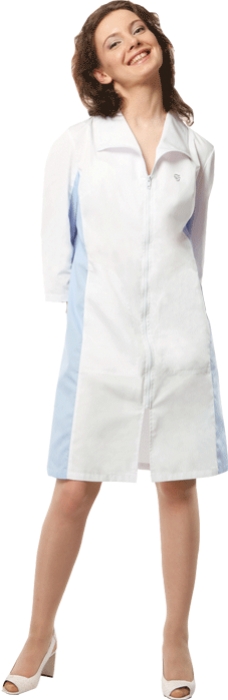 Укороченный халат. Модель отличает оригинальная конструкция воротника и карманов, застежка на декоративную молнию, наличие контрастных деталей, карманы в шве рельефов.